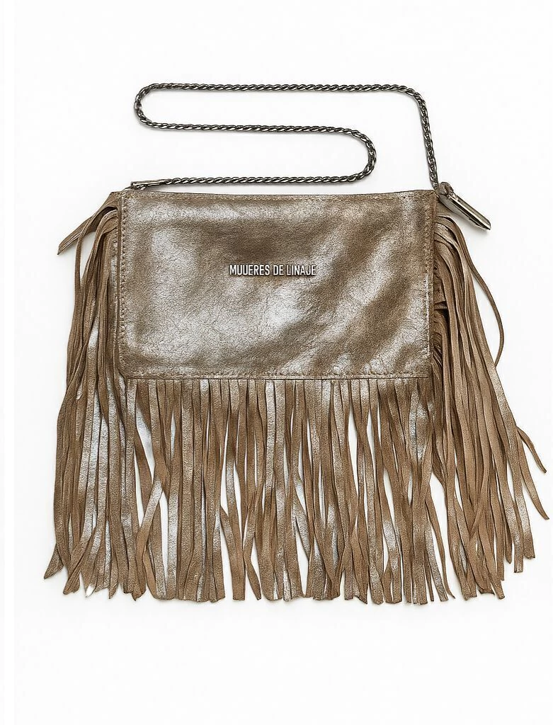 Confeccionada en 100% cuero natural con acabado metalizado suave, destaca por su caída fluida y el movimiento de sus flecos, que aportan un toque sofisticado, moderno y lleno de presencia.
