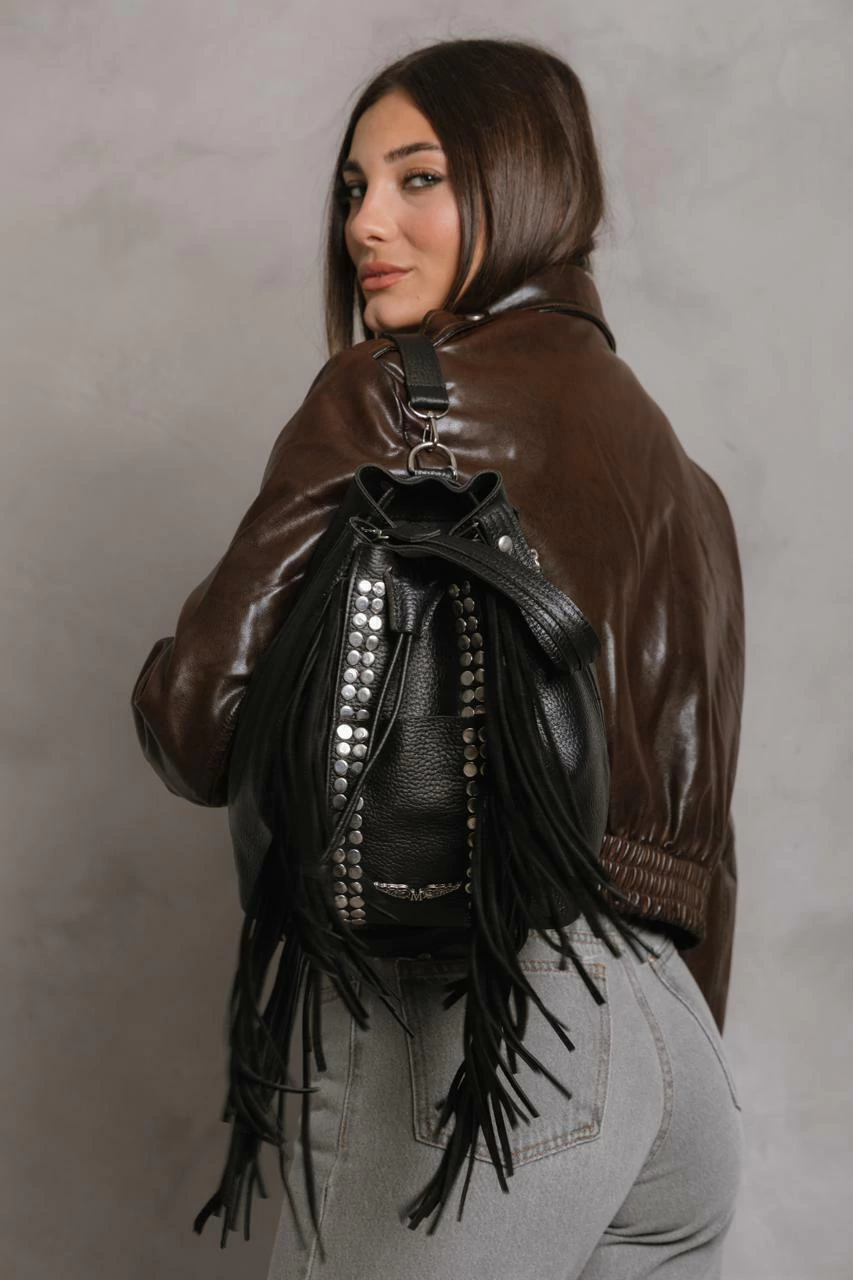 La mochila Espíritu Salvaje está confeccionada en cuero genuino, combinando la textura natural con detalles de flecos largos y apliques metálicos que le otorgan un carácter fuerte y contemporáneo.