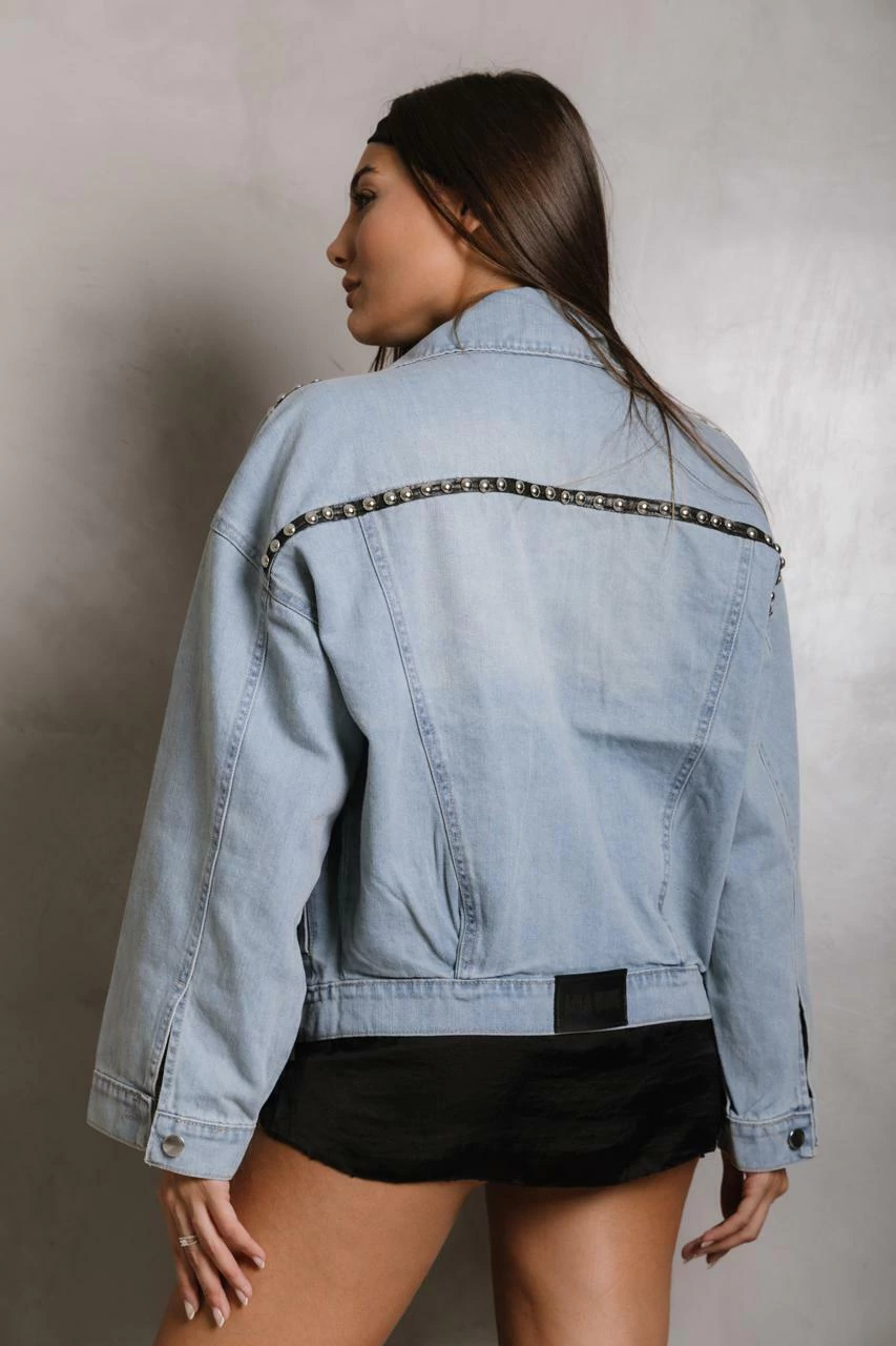 Campera oversized de denim celeste con flecos negros de eco cuero en mangas y frente. Detalle de tachas metálicas que recorren el canesú y realzan el diseño.